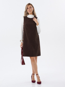 Сарафан выполнен из однотонной коричневой ткани средней плотности с легкой фактурой. Модель прямого силуэта, свободно сидящая по фигуре. Линия плеча классическая, без дополнительных деталей. Горловина округлая, без воротника и отделки. Сарафан без рукавов, с проймами стандартной формы. Низ изделия прямой, без разрезов и декоративных элементов. Лаконичный крой и универсальный цвет делают модель подходящей как для повседневных образов, так и для делового стиля, особенно в сочетании с базовыми блузками или водолазками.