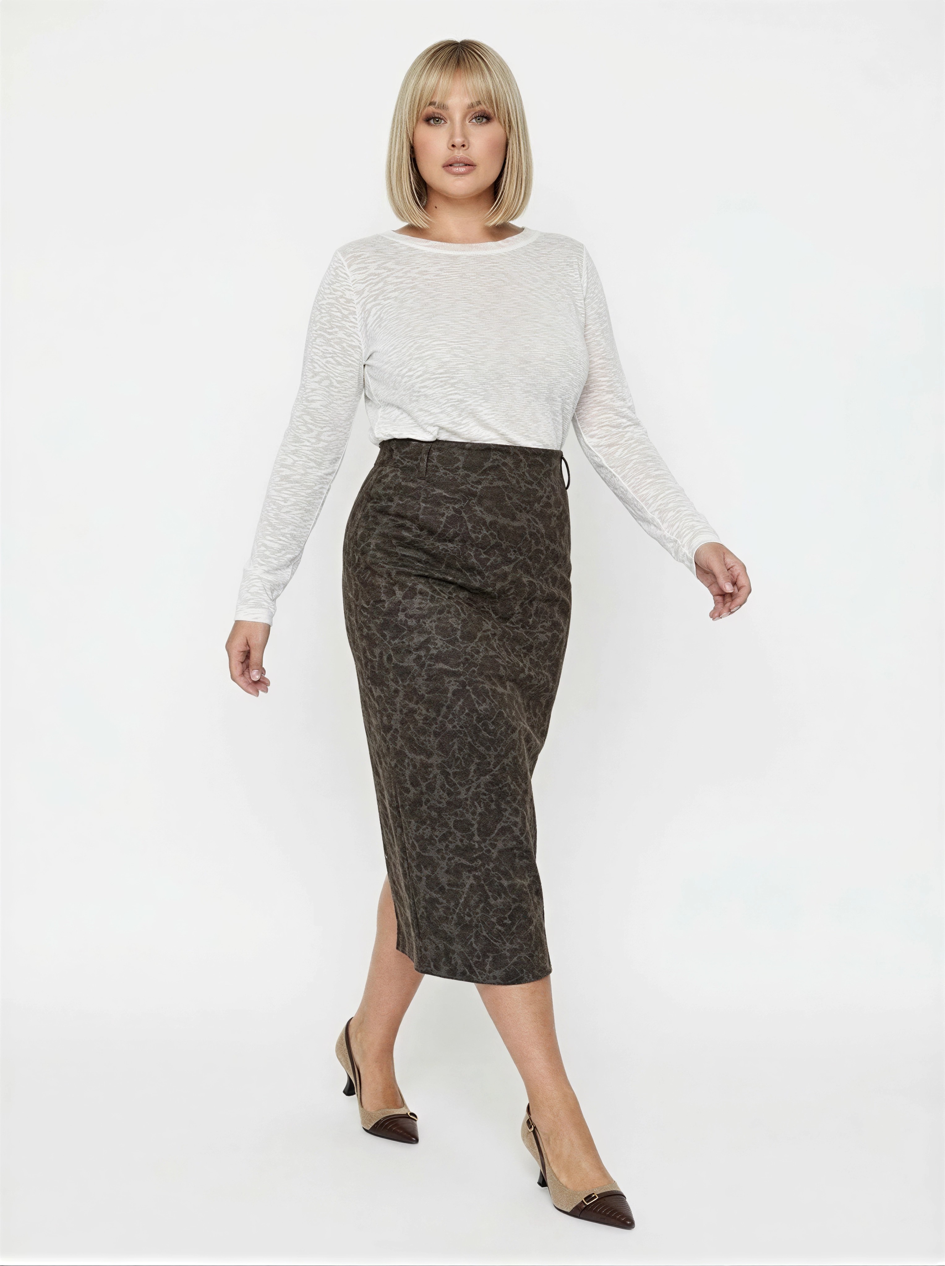 Юбка прямого силуэта выполнена из плотной костюмной ткани с выразительной фактурой. Посадка на талии, длина изделия — макси. Лаконичный крой подчёркивает фигуру, не сковывая движений. Модель без декора, с аккуратной обработкой швов и скрытой застёжкой сзади. Подходит для повседневных и более собранных образов.